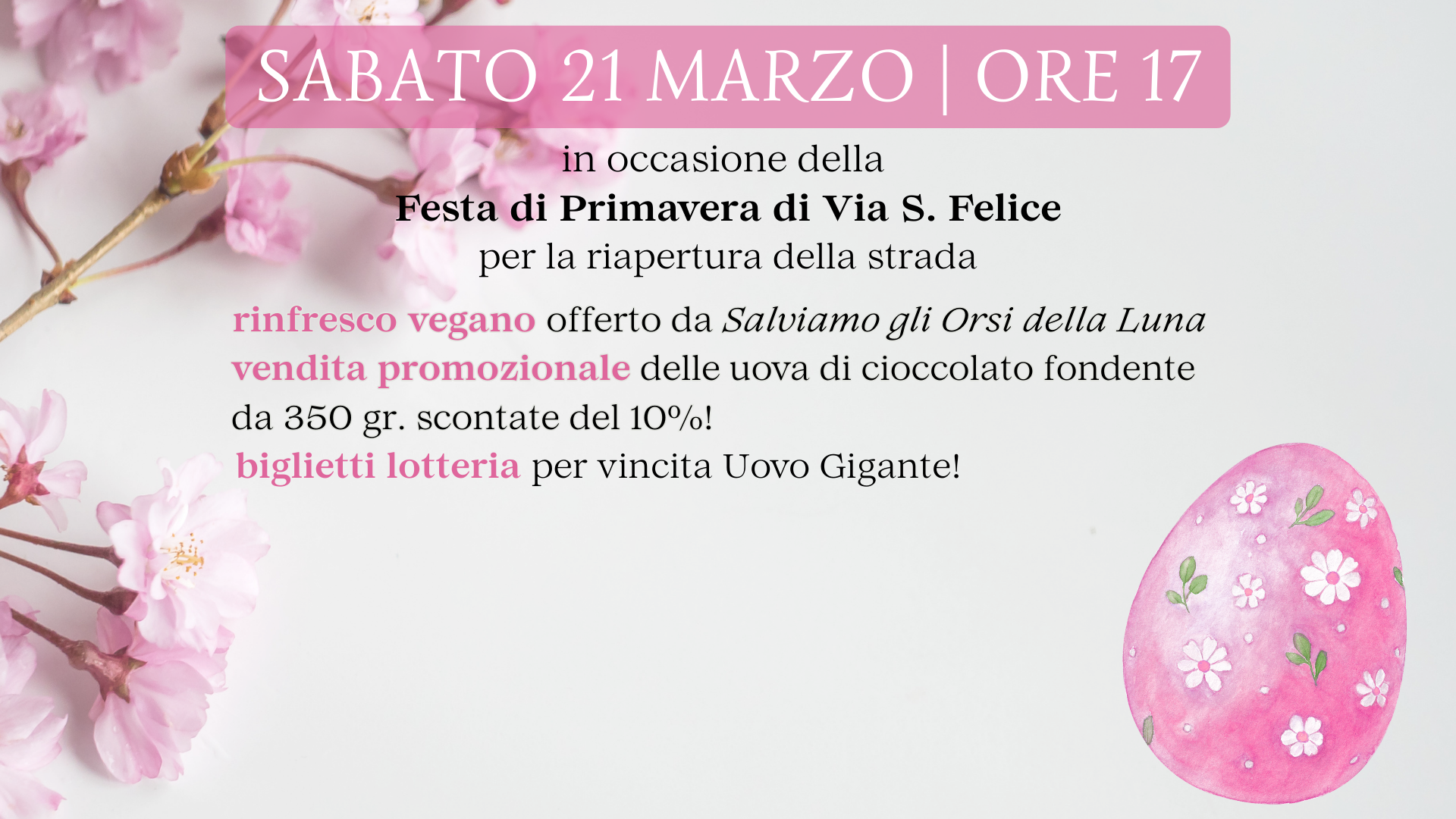 Sabato 21 marzo ti aspettiamo al negozio degli Orsi inVia San Felice 4/B (BO), dalle ore 17 per festeggiare insieme la riapertura della strada dopo i lavori e l’arrivo della primavera.